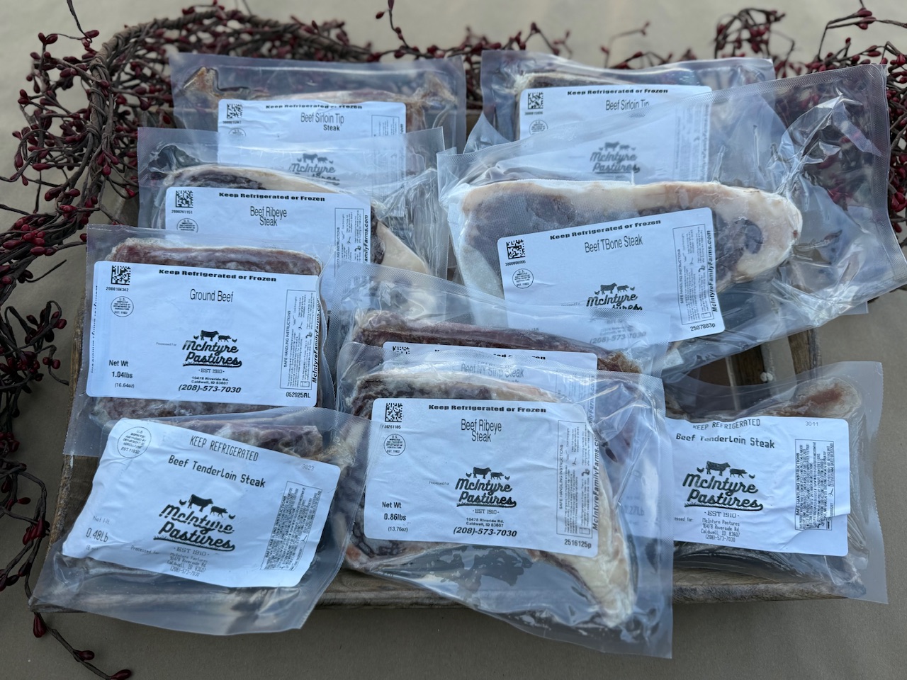 This is the perfect gift to send straight to your friend or relative. We will deliver these on either December 11th or 18th within the Treasure Valley. This is a special delivery route, so it cannot be added onto your home delivery order (or if you do, it won't be free), choose the regular "cowboy" for that. It includes a free McIntyre Pastures insulated cooler bag.